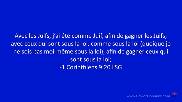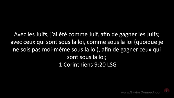 Avec les Juifs, j'ai été comme Juif, afin de gagner les Juifs; avec ceux qui sont sous la loi, comme sous la loi (quoique je ne sois pas moi-même sous la loi), afin de gagner ceux qui sont sous la loi; -1 Corinthiens 9:20 LSG
