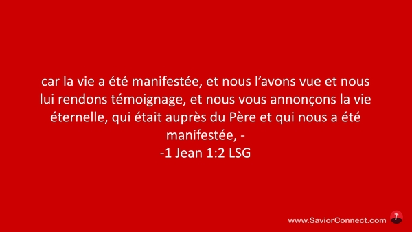 car la vie a été manifestée, et nous l'avons vue et nous lui rendons témoignage, et nous vous annonçons la vie éternelle, qui était auprès du Père et qui nous a été manifestée, - -1 Jean 1:2 LSG