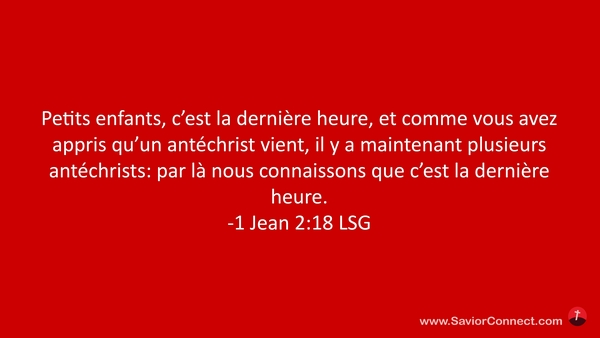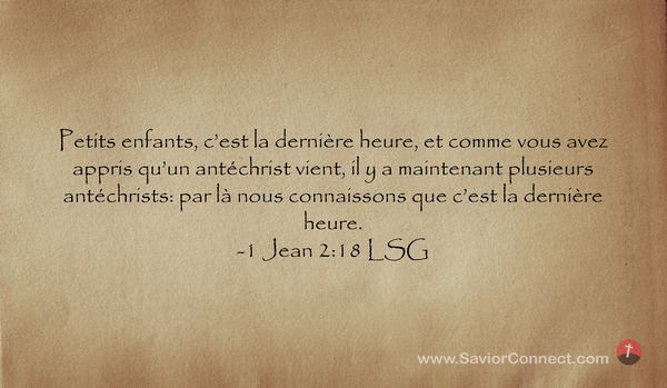 Petits enfants, c'est la dernière heure, et comme vous avez appris qu'un antéchrist vient, il y a maintenant plusieurs antéchrists: par là nous connaissons que c'est la dernière heure. -1 Jean 2:18 LSG