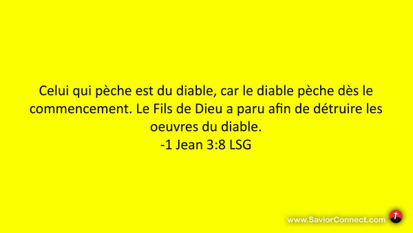 Celui qui pèche est du diable, car le diable pèche dès le commencement. Le Fils de Dieu a paru afin de détruire les oeuvres du diable. -1 Jean 3:8 LSG