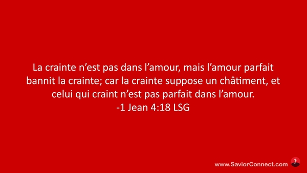 La crainte n'est pas dans l'amour, mais l'amour parfait bannit la crainte; car la crainte suppose un châtiment, et celui qui craint n'est pas parfait dans l'amour. -1 Jean 4:18 LSG