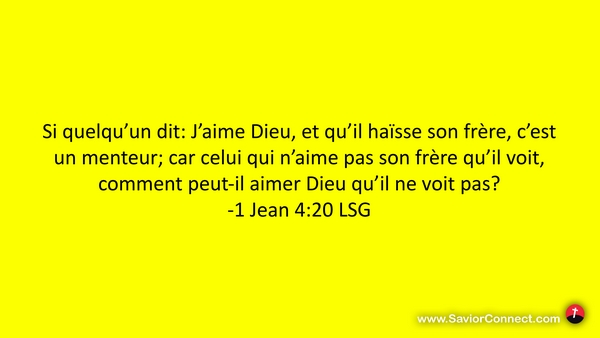Si quelqu'un dit: J'aime Dieu, et qu'il haïsse son frère, c'est un menteur; car celui qui n'aime pas son frère qu'il voit, comment peut-il aimer Dieu qu'il ne voit pas? -1 Jean 4:20 LSG
