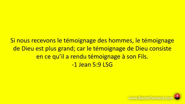 Si nous recevons le témoignage des hommes, le témoignage de Dieu est plus grand; car le témoignage de Dieu consiste en ce qu'il a rendu témoignage à son Fils. -1 Jean 5:9 LSG