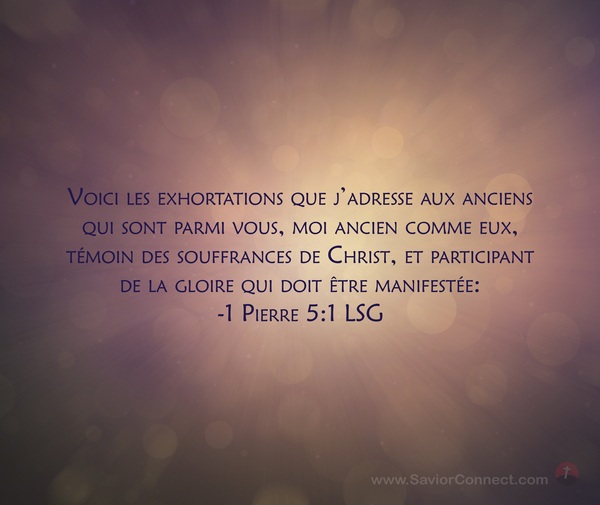Voici les exhortations que j'adresse aux anciens qui sont parmi vous, moi ancien comme eux, témoin des souffrances de Christ, et participant de la gloire qui doit être manifestée: -1 Pierre 5:1 LSG