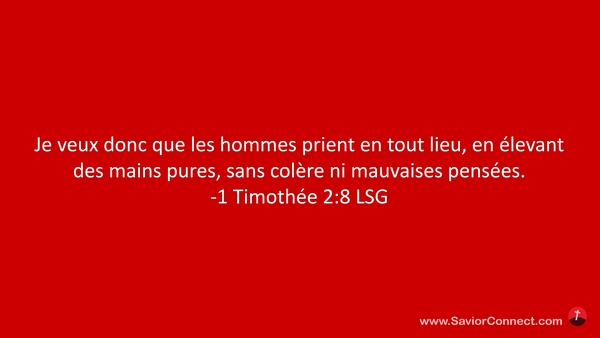 Je veux donc que les hommes prient en tout lieu, en élevant des mains pures, sans colère ni mauvaises pensées. -1 Timothée 2:8 LSG