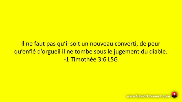 Il ne faut pas qu'il soit un nouveau converti, de peur qu'enflé d'orgueil il ne tombe sous le jugement du diable. -1 Timothée 3:6 LSG