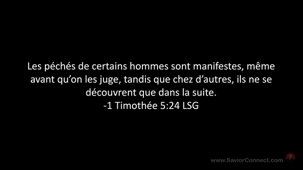 Les péchés de certains hommes sont manifestes, même avant qu'on les juge, tandis que chez d'autres, ils ne se découvrent que dans la suite. -1 Timothée 5:24 LSG