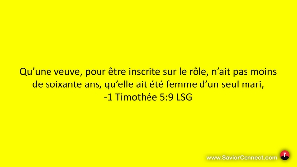 Qu'une veuve, pour être inscrite sur le rôle, n'ait pas moins de soixante ans, qu'elle ait été femme d'un seul mari, -1 Timothée 5:9 LSG