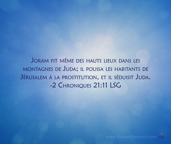 Joram fit même des hauts lieux dans les montagnes de Juda; il poussa les habitants de Jérusalem à la prostitution, et il séduisit Juda. -2 Chroniques 21:11 LSG