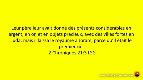 Leur père leur avait donné des présents considérables en argent, en or, et en objets précieux, avec des villes fortes en Juda; mais il laissa le royaume à Joram, parce qu'il était le premier-né. -2 Chroniques 21:3 LSG