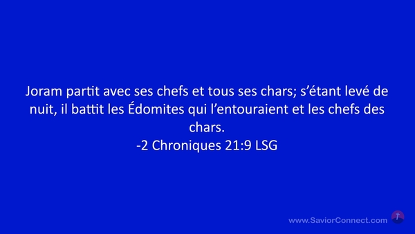 Joram partit avec ses chefs et tous ses chars; s'étant levé de nuit, il battit les Édomites qui l'entouraient et les chefs des chars. -2 Chroniques 21:9 LSG
