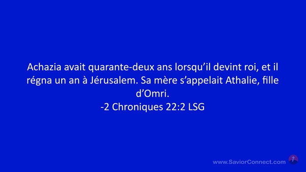 Achazia avait quarante-deux ans lorsqu'il devint roi, et il régna un an à Jérusalem. Sa mère s'appelait Athalie, fille d'Omri. -2 Chroniques 22:2 LSG