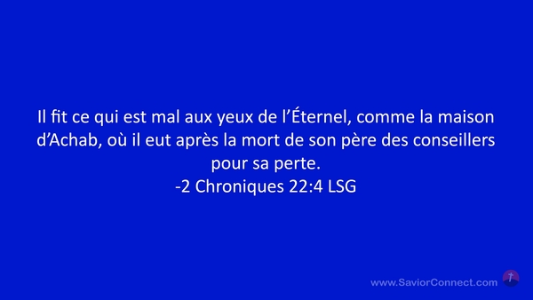 Il fit ce qui est mal aux yeux de l'Éternel, comme la maison d'Achab, où il eut après la mort de son père des conseillers pour sa perte. -2 Chroniques 22:4 LSG