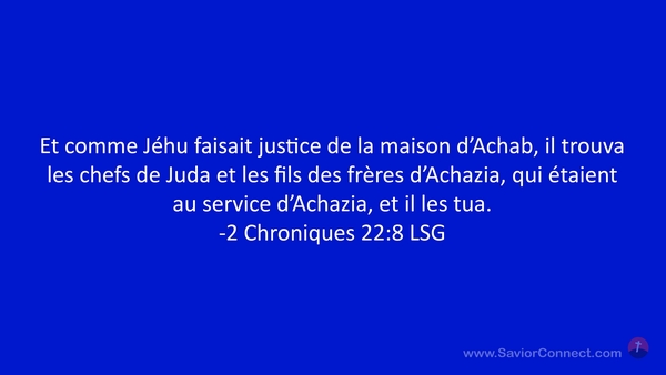 Et comme Jéhu faisait justice de la maison d'Achab, il trouva les chefs de Juda et les fils des frères d'Achazia, qui étaient au service d'Achazia, et il les tua. -2 Chroniques 22:8 LSG