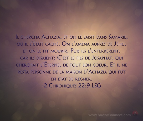 Il chercha Achazia, et on le saisit dans Samarie, où il s'était caché. On l'amena auprès de Jéhu, et on le fit mourir. Puis ils l'enterrèrent, car ils disaient: C'est le fils de Josaphat, qui cherchait l'Éternel de tout son coeur. Et il ne resta personne de la maison d'Achazia qui fût en état de régner. -2 Chroniques 22:9 LSG
