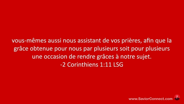 vous-mêmes aussi nous assistant de vos prières, afin que la grâce obtenue pour nous par plusieurs soit pour plusieurs une occasion de rendre grâces à notre sujet. -2 Corinthiens 1:11 LSG