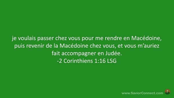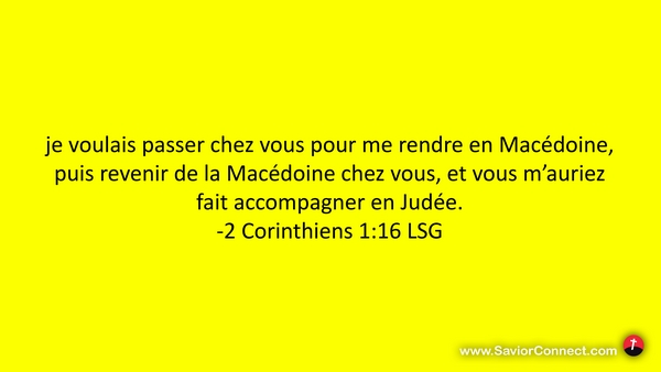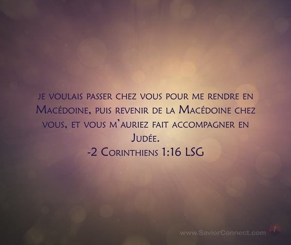 je voulais passer chez vous pour me rendre en Macédoine, puis revenir de la Macédoine chez vous, et vous m'auriez fait accompagner en Judée. -2 Corinthiens 1:16 LSG