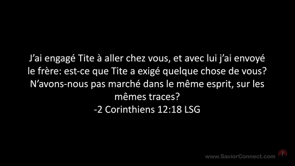 J'ai engagé Tite à aller chez vous, et avec lui j'ai envoyé le frère: est-ce que Tite a exigé quelque chose de vous? N'avons-nous pas marché dans le même esprit, sur les mêmes traces? -2 Corinthiens 12:18 LSG