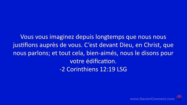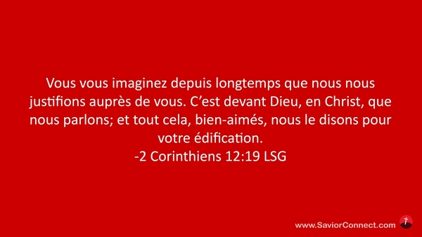 Vous vous imaginez depuis longtemps que nous nous justifions auprès de vous. C'est devant Dieu, en Christ, que nous parlons; et tout cela, bien-aimés, nous le disons pour votre édification. -2 Corinthiens 12:19 LSG