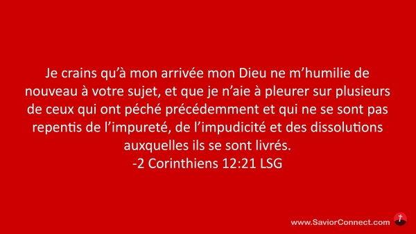 Je crains qu'à mon arrivée mon Dieu ne m'humilie de nouveau à votre sujet, et que je n'aie à pleurer sur plusieurs de ceux qui ont péché précédemment et qui ne se sont pas repentis de l'impureté, de l'impudicité et des dissolutions auxquelles ils se sont livrés. -2 Corinthiens 12:21 LSG
