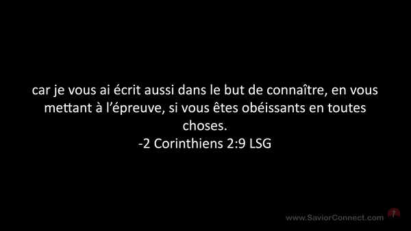 car je vous ai écrit aussi dans le but de connaître, en vous mettant à l'épreuve, si vous êtes obéissants en toutes choses. -2 Corinthiens 2:9 LSG