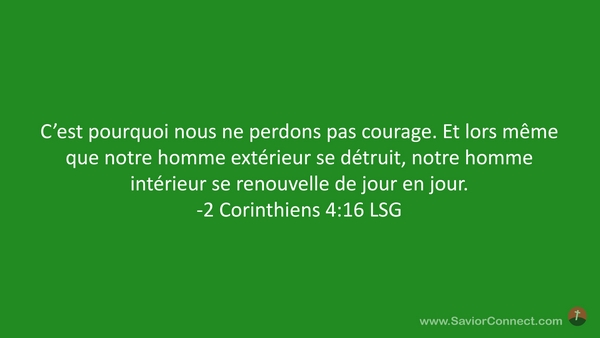 C'est pourquoi nous ne perdons pas courage. Et lors même que notre homme extérieur se détruit, notre homme intérieur se renouvelle de jour en jour. -2 Corinthiens 4:16 LSG
