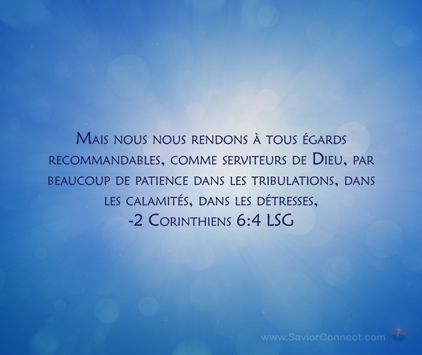Mais nous nous rendons à tous égards recommandables, comme serviteurs de Dieu, par beaucoup de patience dans les tribulations, dans les calamités, dans les détresses, -2 Corinthiens 6:4 LSG