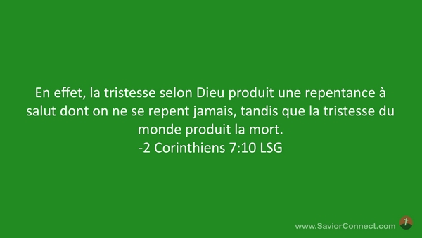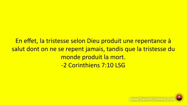 En effet, la tristesse selon Dieu produit une repentance à salut dont on ne se repent jamais, tandis que la tristesse du monde produit la mort. -2 Corinthiens 7:10 LSG
