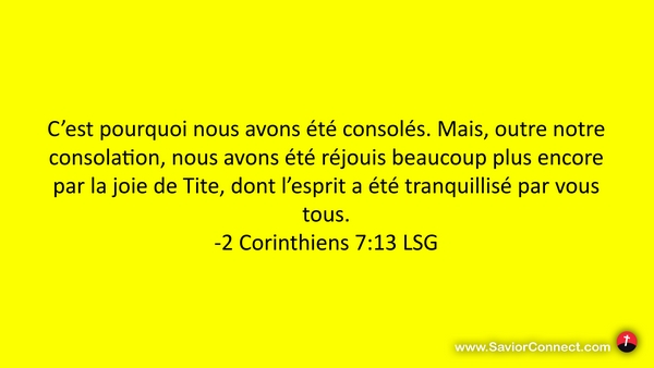 C'est pourquoi nous avons été consolés. Mais, outre notre consolation, nous avons été réjouis beaucoup plus encore par la joie de Tite, dont l'esprit a été tranquillisé par vous tous. -2 Corinthiens 7:13 LSG
