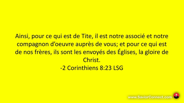 Ainsi, pour ce qui est de Tite, il est notre associé et notre compagnon d'oeuvre auprès de vous; et pour ce qui est de nos frères, ils sont les envoyés des Églises, la gloire de Christ. -2 Corinthiens 8:23 LSG