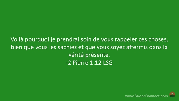 Voilà pourquoi je prendrai soin de vous rappeler ces choses, bien que vous les sachiez et que vous soyez affermis dans la vérité présente. -2 Pierre 1:12 LSG