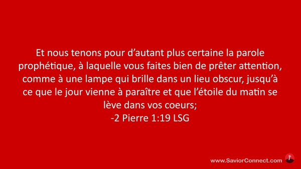 Et nous tenons pour d'autant plus certaine la parole prophétique, à laquelle vous faites bien de prêter attention, comme à une lampe qui brille dans un lieu obscur, jusqu'à ce que le jour vienne à paraître et que l'étoile du matin se lève dans vos coeurs; -2 Pierre 1:19 LSG