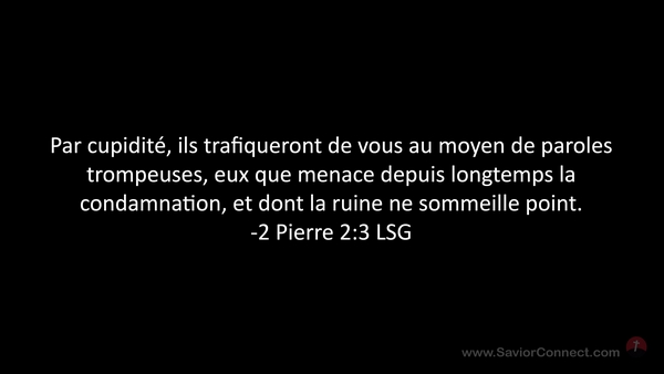 Par cupidité, ils trafiqueront de vous au moyen de paroles trompeuses, eux que menace depuis longtemps la condamnation, et dont la ruine ne sommeille point. -2 Pierre 2:3 LSG