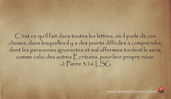 C'est ce qu'il fait dans toutes les lettres, où il parle de ces choses, dans lesquelles il y a des points difficiles à comprendre, dont les personnes ignorantes et mal affermies tordent le sens, comme celui des autres Écritures, pour leur propre ruine. -2 Pierre 3:16 LSG