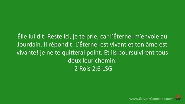 Élie lui dit: Reste ici, je te prie, car l'Éternel m'envoie au Jourdain. Il répondit: L'Éternel est vivant et ton âme est vivante! je ne te quitterai point. Et ils poursuivirent tous deux leur chemin. -2 Rois 2:6 LSG