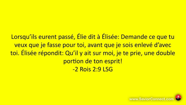 Lorsqu'ils eurent passé, Élie dit à Élisée: Demande ce que tu veux que je fasse pour toi, avant que je sois enlevé d'avec toi. Élisée répondit: Qu'il y ait sur moi, je te prie, une double portion de ton esprit! -2 Rois 2:9 LSG
