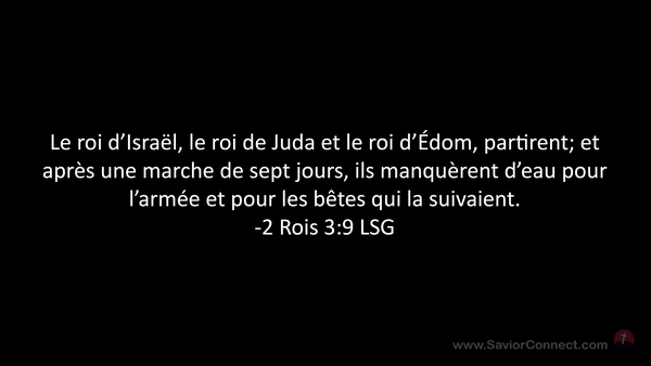 Le roi d'Israël, le roi de Juda et le roi d'Édom, partirent; et après une marche de sept jours, ils manquèrent d'eau pour l'armée et pour les bêtes qui la suivaient. -2 Rois 3:9 LSG