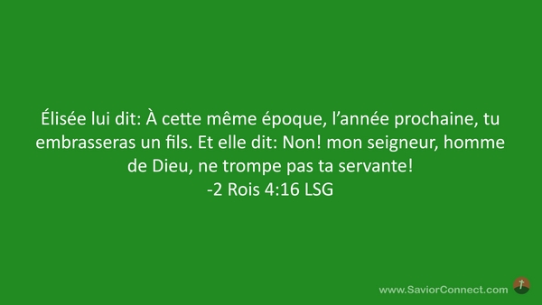 Élisée lui dit: À cette même époque, l'année prochaine, tu embrasseras un fils. Et elle dit: Non! mon seigneur, homme de Dieu, ne trompe pas ta servante! -2 Rois 4:16 LSG