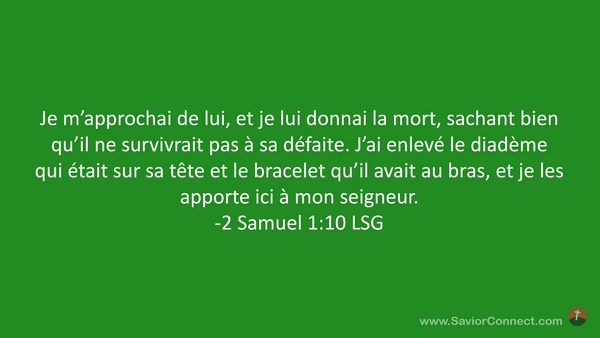 Je m'approchai de lui, et je lui donnai la mort, sachant bien qu'il ne survivrait pas à sa défaite. J'ai enlevé le diadème qui était sur sa tête et le bracelet qu'il avait au bras, et je les apporte ici à mon seigneur. -2 Samuel 1:10 LSG