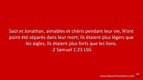 Saül et Jonathan, aimables et chéris pendant leur vie, N'ont point été séparés dans leur mort; Ils étaient plus légers que les aigles, Ils étaient plus forts que les lions. -2 Samuel 1:23 LSG