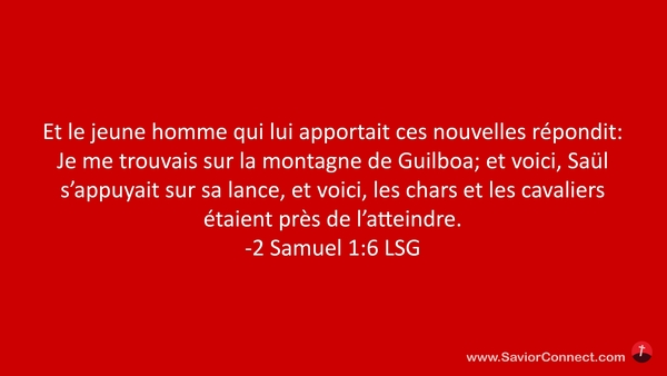 Et le jeune homme qui lui apportait ces nouvelles répondit: Je me trouvais sur la montagne de Guilboa; et voici, Saül s'appuyait sur sa lance, et voici, les chars et les cavaliers étaient près de l'atteindre. -2 Samuel 1:6 LSG