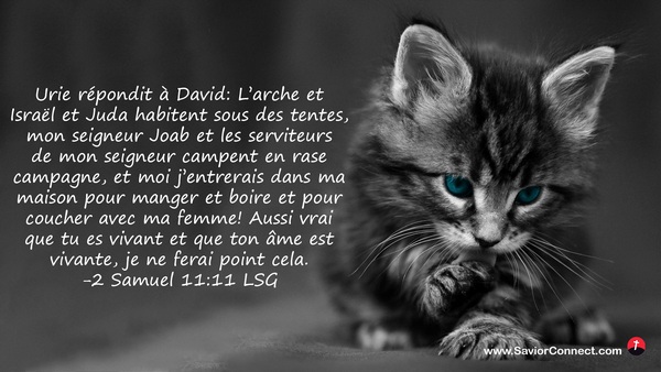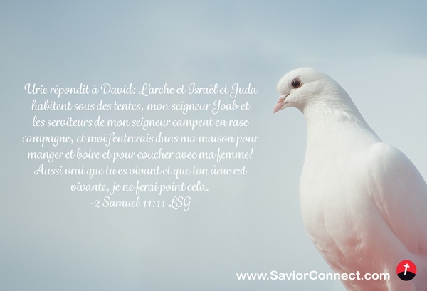 Urie répondit à David: L'arche et Israël et Juda habitent sous des tentes, mon seigneur Joab et les serviteurs de mon seigneur campent en rase campagne, et moi j'entrerais dans ma maison pour manger et boire et pour coucher avec ma femme! Aussi vrai que tu es vivant et que ton âme est vivante, je ne ferai point cela. -2 Samuel 11:11 LSG
