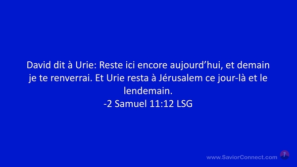 David dit à Urie: Reste ici encore aujourd'hui, et demain je te renverrai. Et Urie resta à Jérusalem ce jour-là et le lendemain. -2 Samuel 11:12 LSG