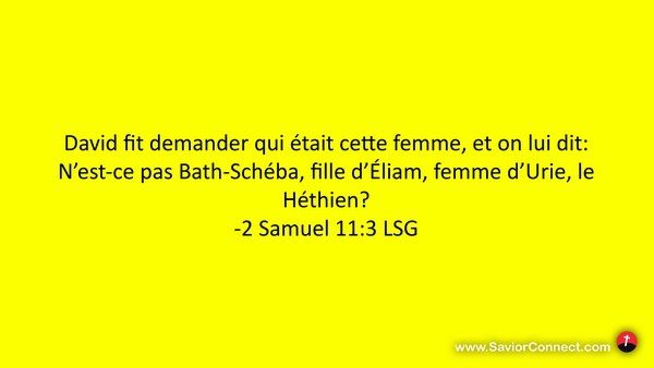 David fit demander qui était cette femme, et on lui dit: N'est-ce pas Bath-Schéba, fille d'Éliam, femme d'Urie, le Héthien? -2 Samuel 11:3 LSG