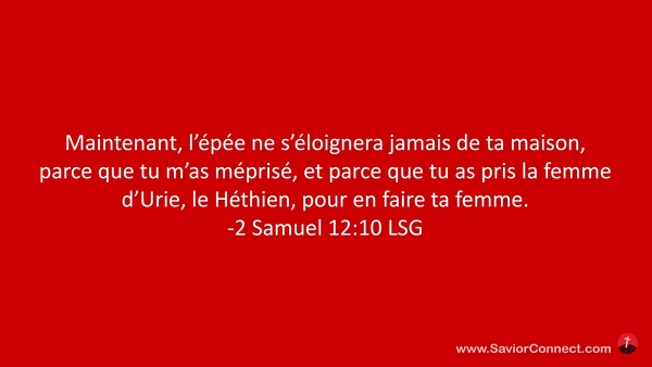 Maintenant, l'épée ne s'éloignera jamais de ta maison, parce que tu m'as méprisé, et parce que tu as pris la femme d'Urie, le Héthien, pour en faire ta femme. -2 Samuel 12:10 LSG