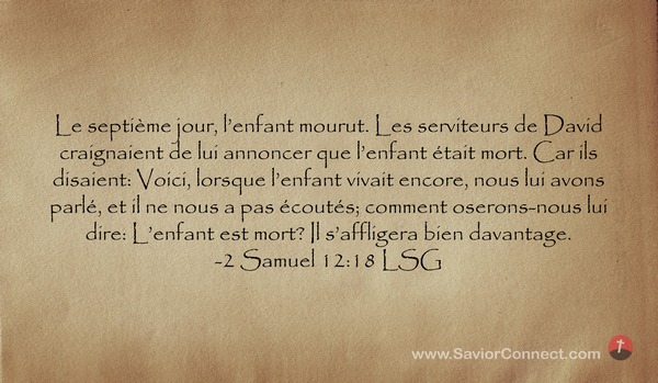 Le septième jour, l'enfant mourut. Les serviteurs de David craignaient de lui annoncer que l'enfant était mort. Car ils disaient: Voici, lorsque l'enfant vivait encore, nous lui avons parlé, et il ne nous a pas écoutés; comment oserons-nous lui dire: L'enfant est mort? Il s'affligera bien davantage. -2 Samuel 12:18 LSG