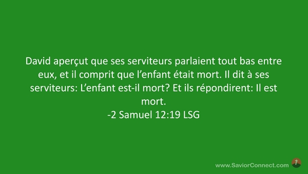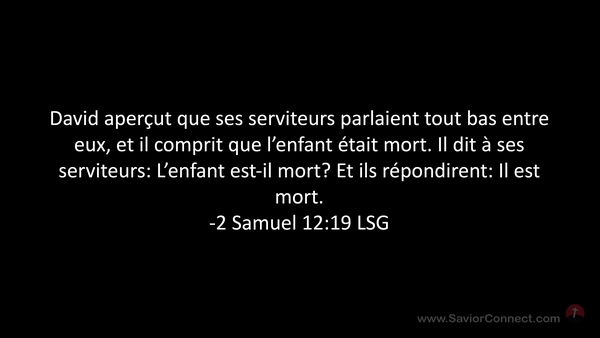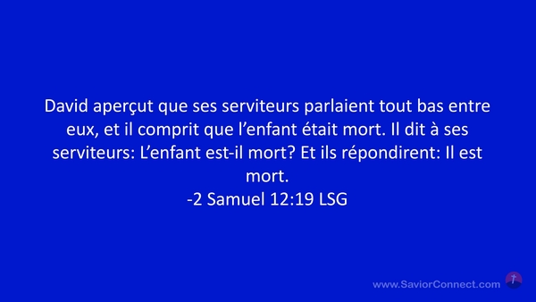 David aperçut que ses serviteurs parlaient tout bas entre eux, et il comprit que l'enfant était mort. Il dit à ses serviteurs: L'enfant est-il mort? Et ils répondirent: Il est mort. -2 Samuel 12:19 LSG
