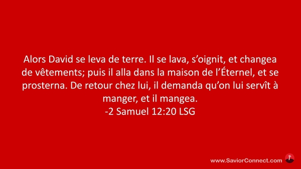 Alors David se leva de terre. Il se lava, s'oignit, et changea de vêtements; puis il alla dans la maison de l'Éternel, et se prosterna. De retour chez lui, il demanda qu'on lui servît à manger, et il mangea. -2 Samuel 12:20 LSG