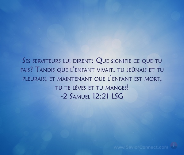 Ses serviteurs lui dirent: Que signifie ce que tu fais? Tandis que l'enfant vivait, tu jeûnais et tu pleurais; et maintenant que l'enfant est mort, tu te lèves et tu manges! -2 Samuel 12:21 LSG