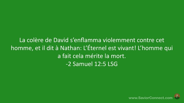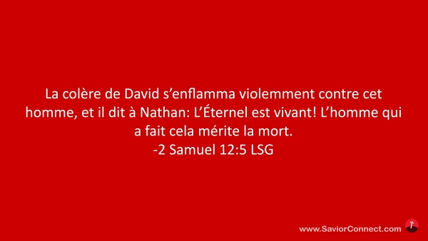 La colère de David s'enflamma violemment contre cet homme, et il dit à Nathan: L'Éternel est vivant! L'homme qui a fait cela mérite la mort. -2 Samuel 12:5 LSG